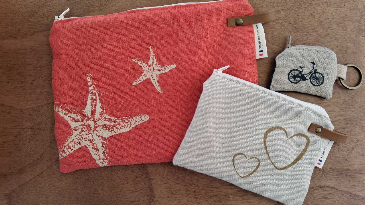 Chaque accessoire, au format pratique, est conçue dans le même univers que nos sacs et coussins ; toujours confectionné avec du lin, sérigraphié sur les mêmes thèmes qui m'animent : nature, océan, vélo, van, tout dans l'esprit du Bassin.