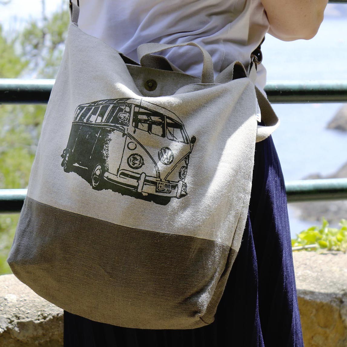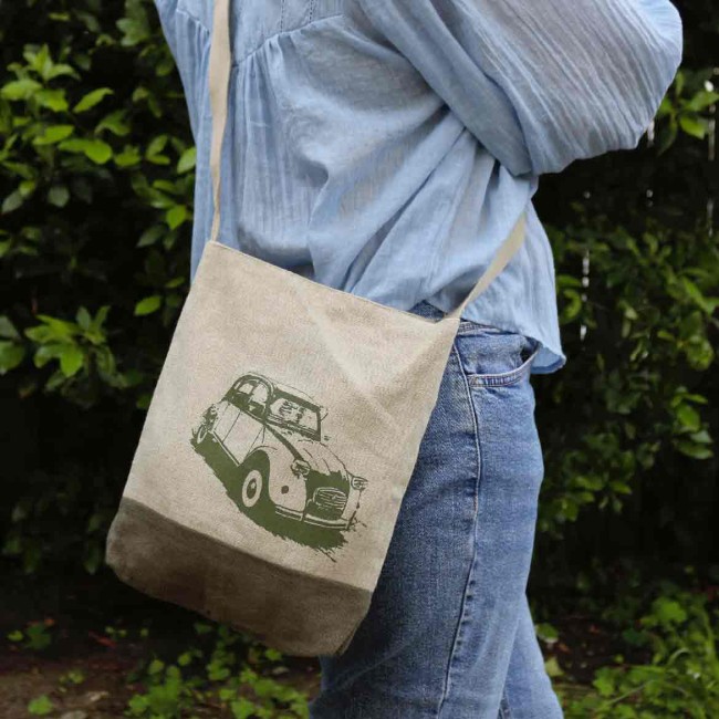 - Sac en lin beige et le bas kaki, entièrement doublé, fermé par un bouton pression en laiton vieilli. Sangle en coton.