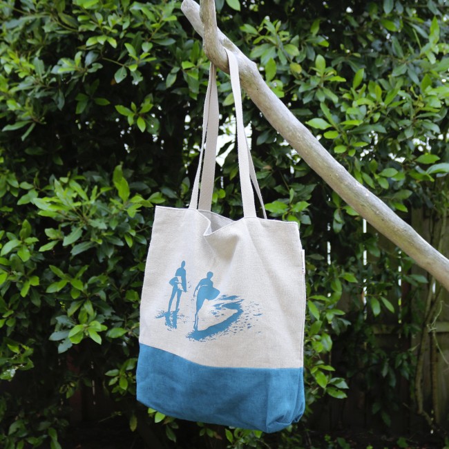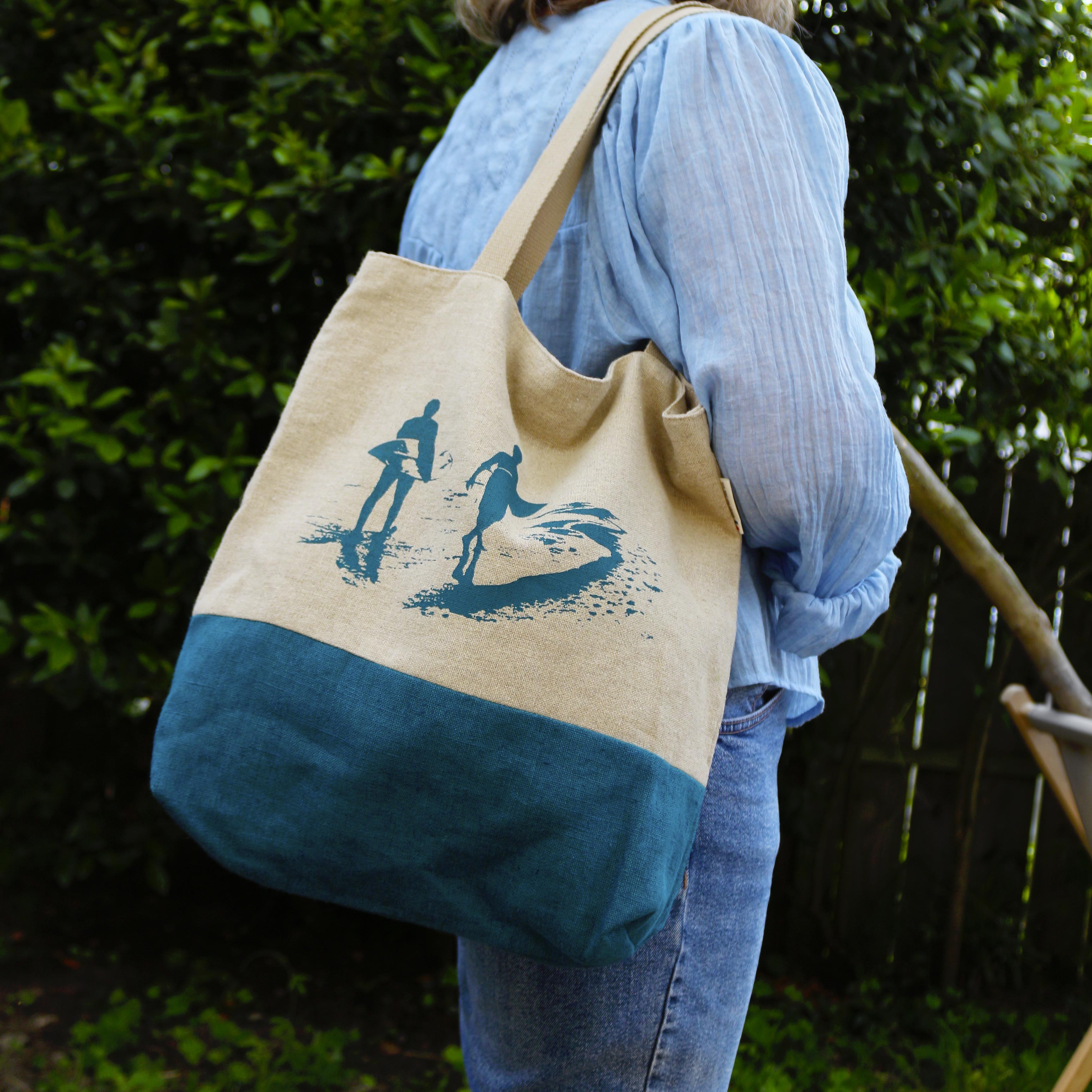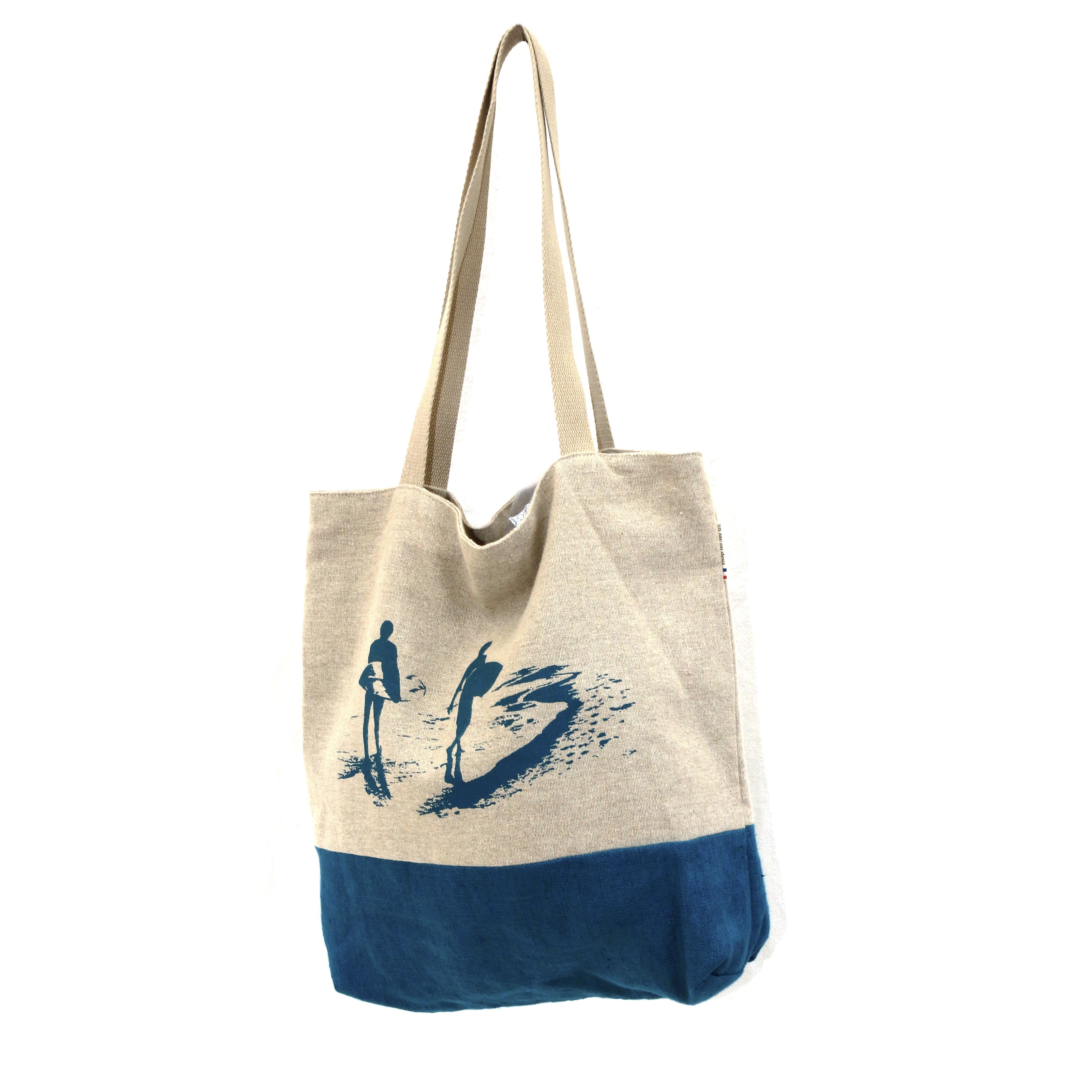 Sac en lin beige et le bas bleu, entièrement doublé, fermé par un bouton pression en laiton vieilli. Sangle en coton.