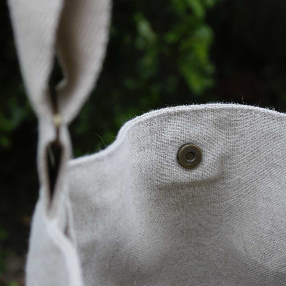 Ce sac est entièrement doublé en lin couleur beige et recto-verso couleurs beige-brick possibilité de le fermer avec un bouton pression en laiton vieilli. La sangle est réglable, pratique pour le régler à votre convenance.