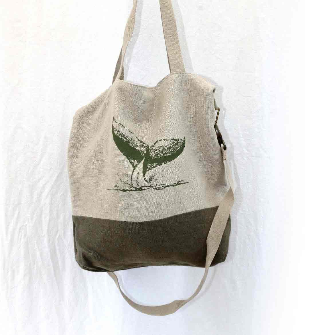 Sac avec deux sangles en coton pour un porté main ou épaule et avec sa sangle réglable et amovible grâce aux mousquetons en laiton vieilli, ce sac est 100% en lin, fibre durable et écologique. Il est entièrement doublé pour une belle tenue et qui le rend robuste et à la fois léger et souple. Il se ferme avec un bouton pression en laiton vieilli. Ce sac a une grande capacité, parfait pour vous accompagner en voyage, en balade, vos sorties en ville et aussi pour les lycéens pour y ranger cahiers et classeurs. La sérigraphie de la Baleine apporte de l'esthétisme à ce sac, symbole de sérénité et de voyage.