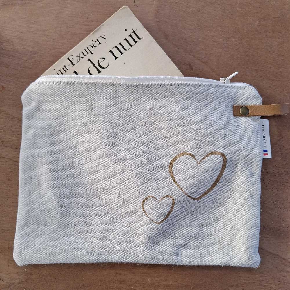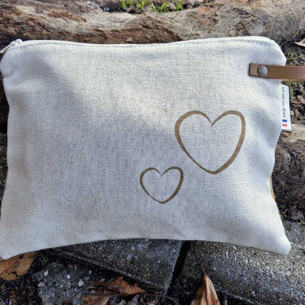 Spacieuse, cette pochette grand format est doublée, en lin, couleur écru, coeurs beige, fermée par un zip. Un lien en simil cuir est fixé sur le côté par un rivet en laiton vieilli.