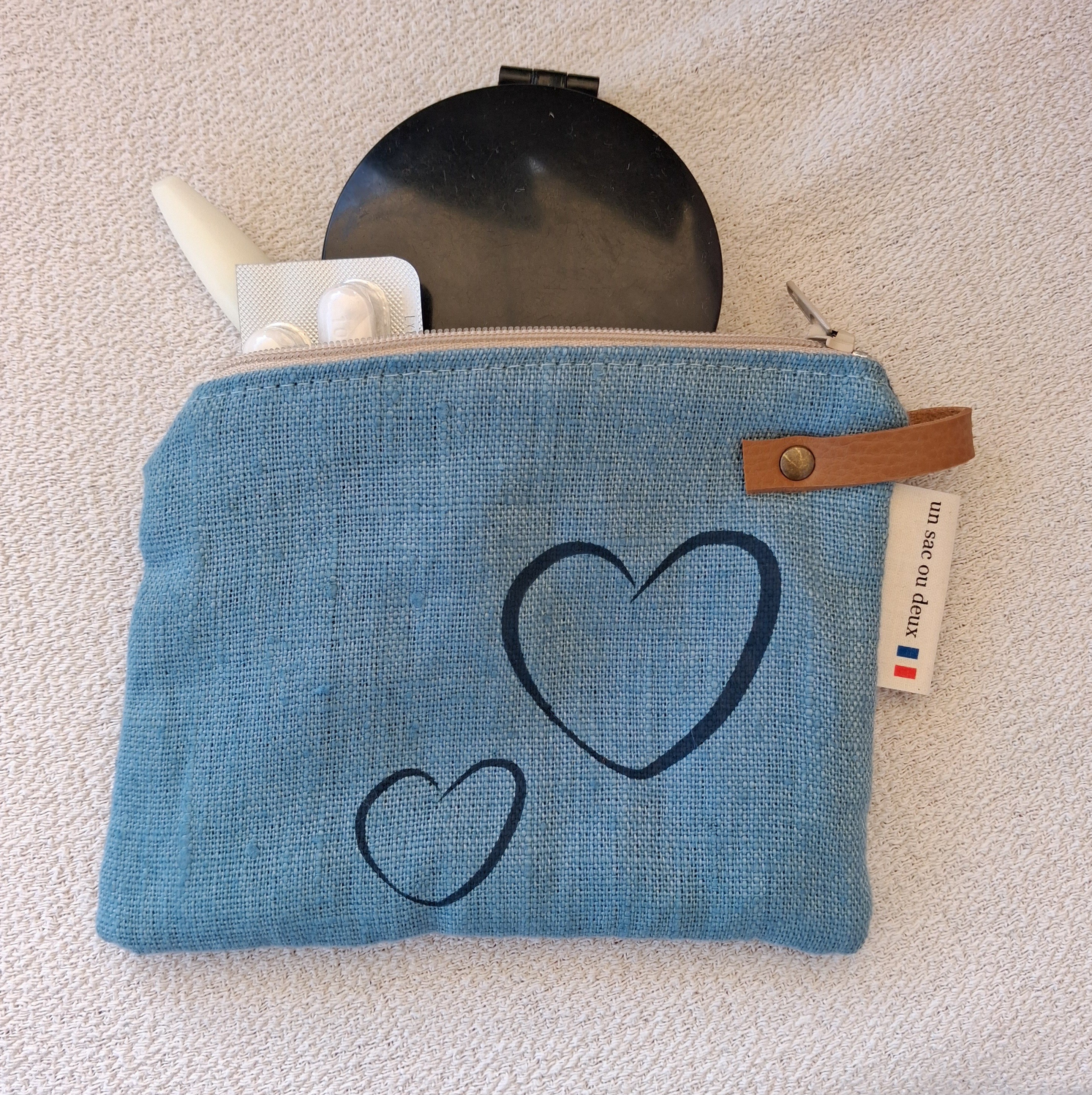 Référence : pochette petit format bleu clair/bleu marine cœurs bleus