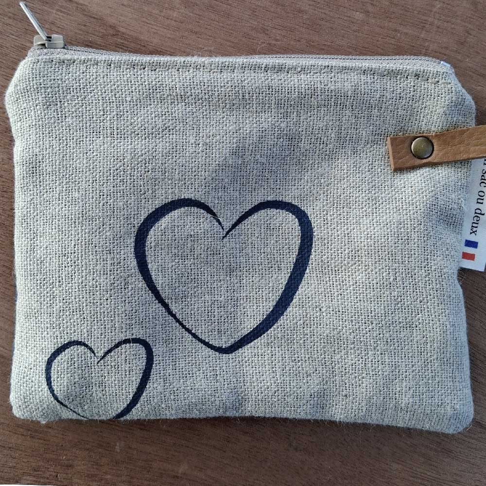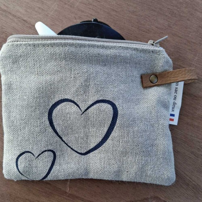 Pochette petit format, en lin, doublée, couleur beige, sérigraphie coeurs bleus, fermée par un zip. Un petit rivet en laiton vieilli posé sur le côté pour fixer un lien en simili cuir.