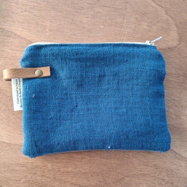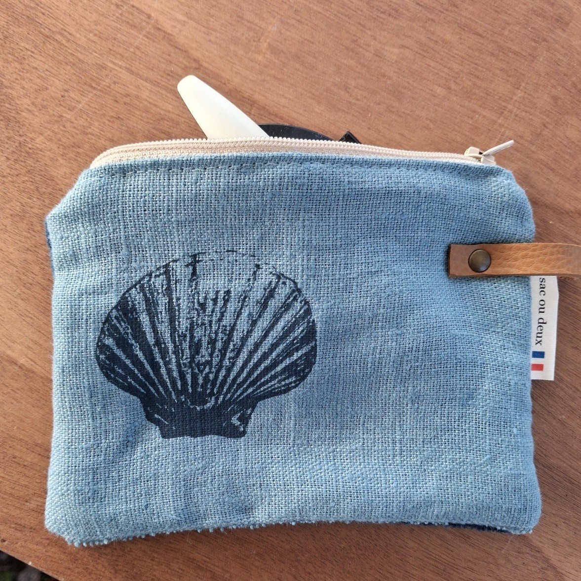 Pochette petit format, en lin, doublée, couleur bleu clair, sérigraphie Coquille Saint Jacques, fermée par un zip. Un petit rivet en laiton vieilli posé sur le côté pour fixer un lien en simili cuir.