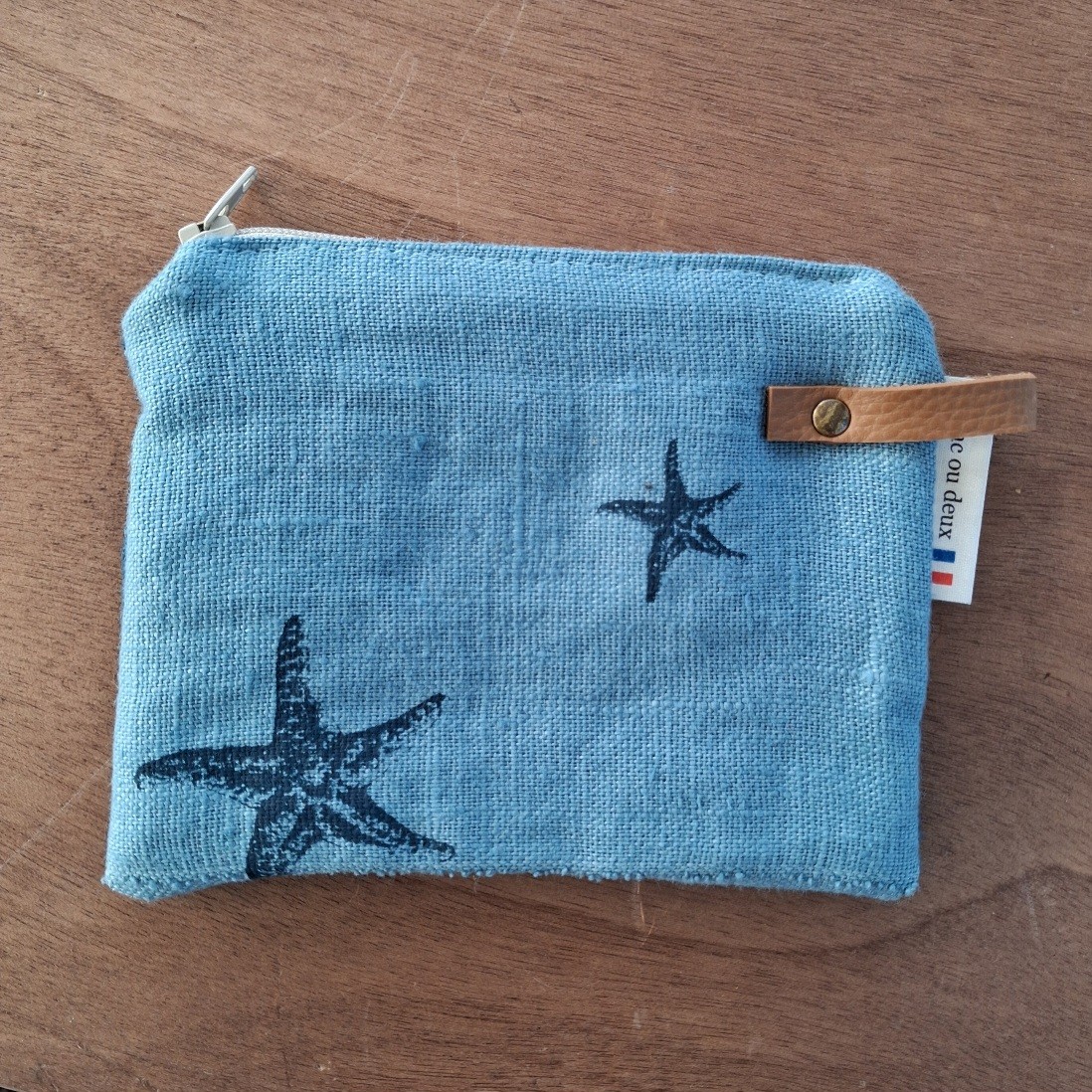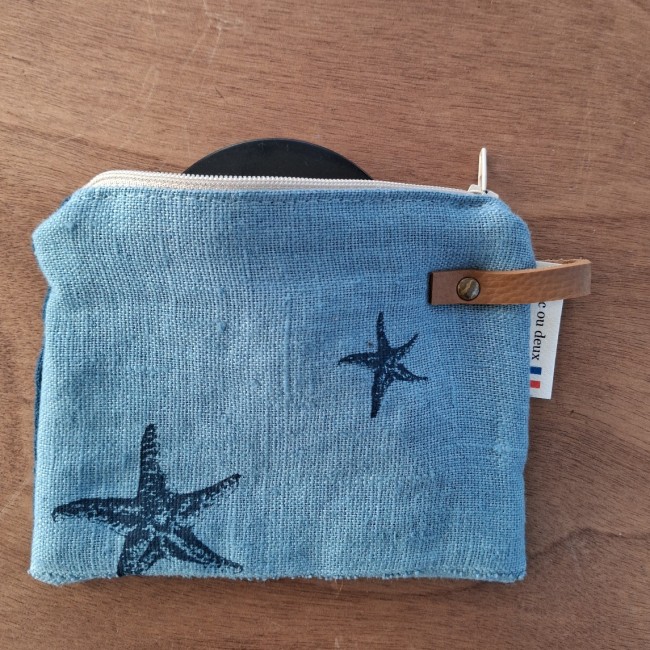 Pochette petit format, en lin, doublée, couleur bleu clair, sérigraphie Etoiles de mer, fermée par un zip. Un petit rivet en laiton vieilli posé sur le côté pour fixer un lien en simili cuir.