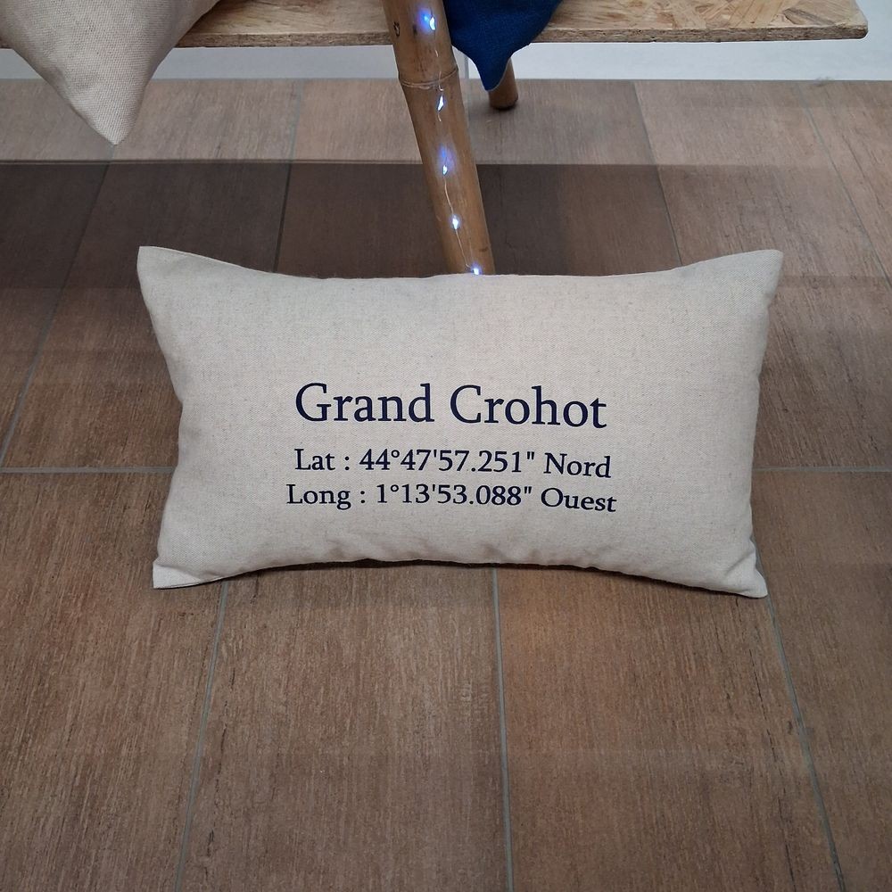 Ici le coussin reprend les coordonnées GPS de la plage du Grand Crohot, une des grande plage océane de la presqu'ile du Cap Ferret. Rendez-vous des surfeurs, mais aussi des familles en vacances.