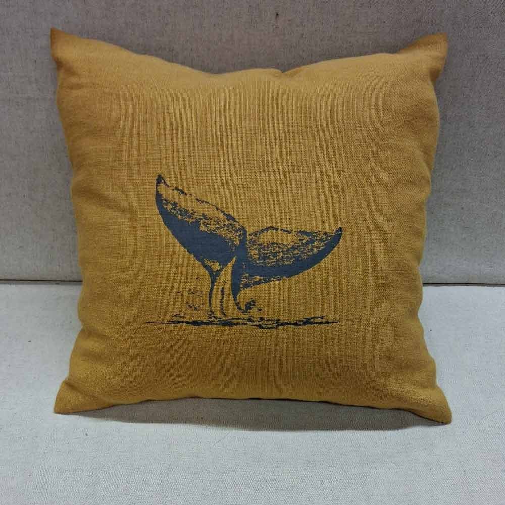 De format 45x45, housse déhoussable en portefeuille, couleur safran 100% lin. Dessin d'une queue de baleine couleur grise.